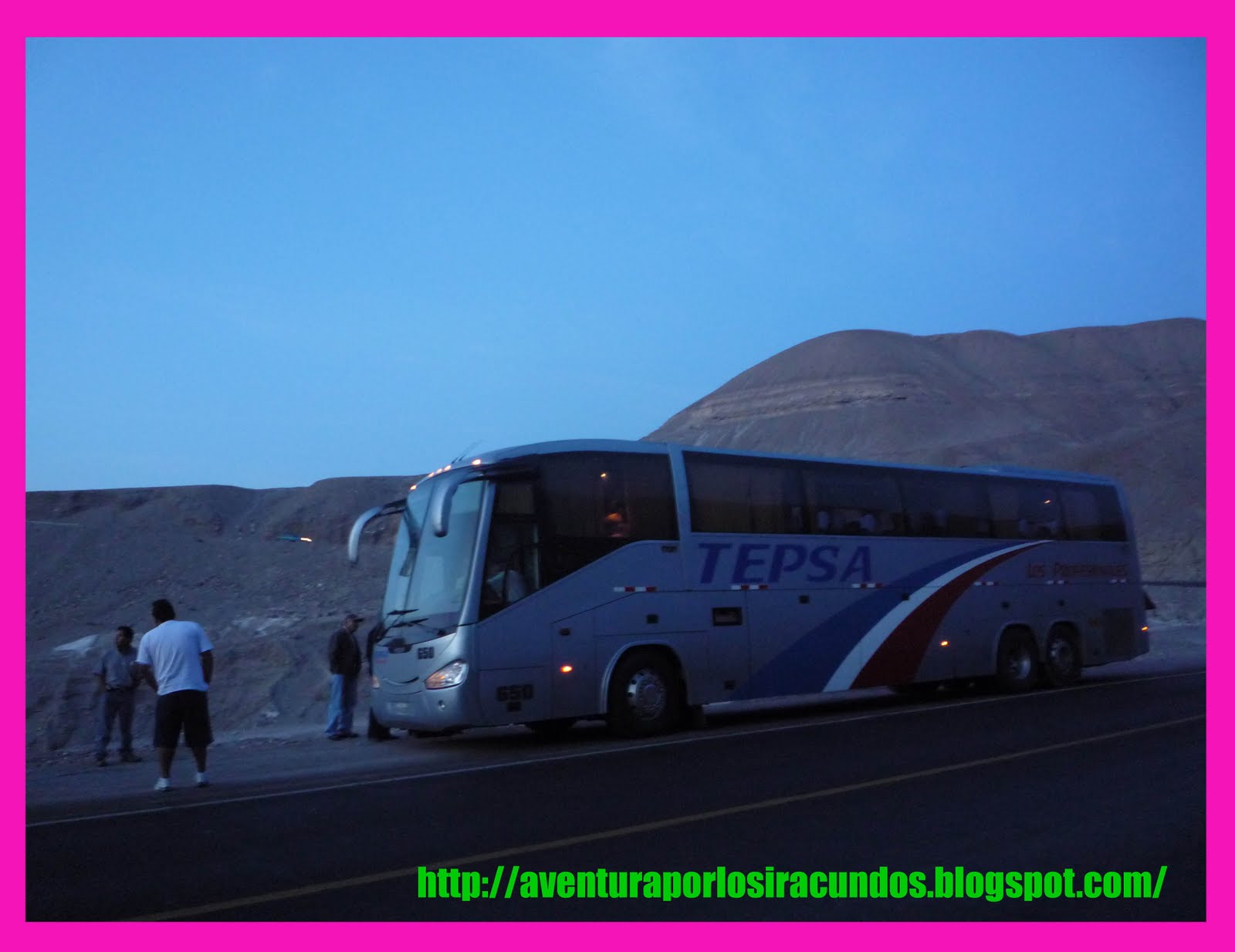 Partimos sin contratiempos, por la carretera Panamericana Sur. A eso de las 7 pm bajamos en ICA para la cena y luego seguir el viaje. Sin embargo estando en el Km 924, en el lugar llamado Bajada de Sihuas , ocurrió que se malogró el omnibus.. auxilio!!! jejeje! , eran las 5 de la mañana en un lugar desolado de Arequipa, pero gracias a la ayuda de la gente , arreglaron la movilidad después de 3 horas de esperar y de ahi seguimos rumbo hacia Moquegua..!!!